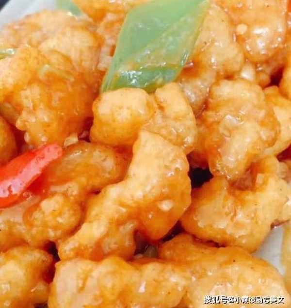 3、锅内留底油,加入白糖和米醋炒至浓稠,再放入青红椒和鸡柳,大火翻炒两分钟后入锅。