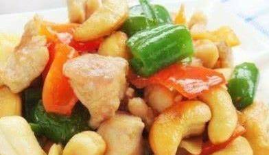 准备:1.将鸡肉洗净,切丁,刷上蛋清备用;将腰果炒至金黄色备用;