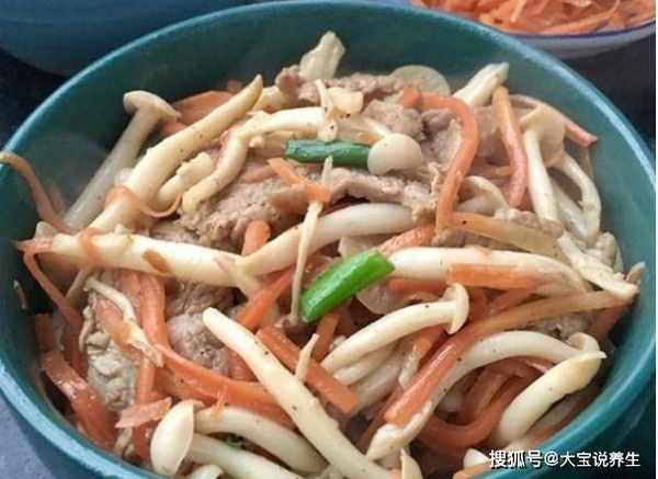 6.加入蘑菇和胡萝卜,炒均匀撒上洋葱芽。