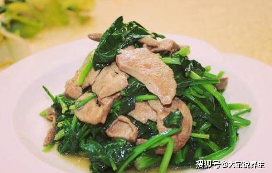 6、待猪肝变色时,加入焯过水的菠菜,炒匀。
