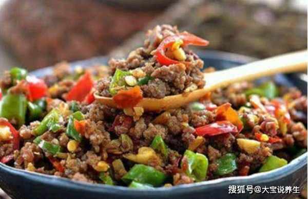 4、倒入牛肉末快炒,加1汤匙料酒和生抽,边炒边炒至水快收干,加入辣椒粉,淋少许香油,加少许鸡精即成.