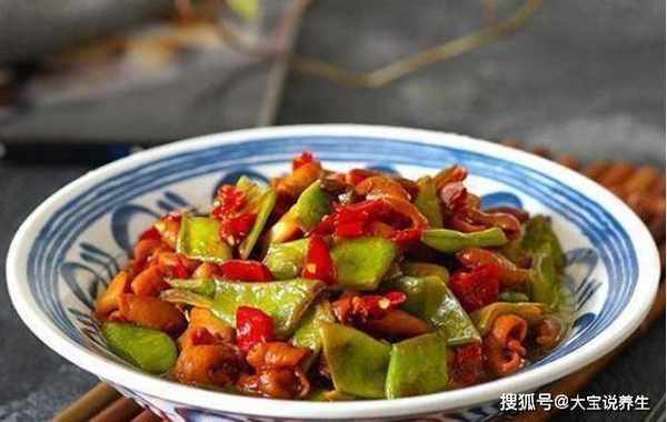 材料:熟猪大肠260克、四季豆100克、红辣椒10个、生抽1汤匙、老抽1茶匙、蒜头4瓣、花椒1小把、姜片3片,适量的盐