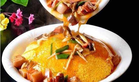 3、干净的锅里放色拉油,加热到70%的火候,然后捞出肉块,炸至表皮起皱,捞出沥油。另外,将锅巴放入油锅中,炸至酥脆后放入锅底。