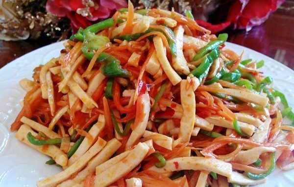 材料:千叶豆腐150克,香菇50克,花椒30克,胡萝卜50克,大蒜适量,红辣椒适量,白糖1茶匙,白醋半茶匙,老醋1茶匙,盐2克、胡椒粉少许、水淀粉少许、生抽1茶匙、干淀粉1茶匙
