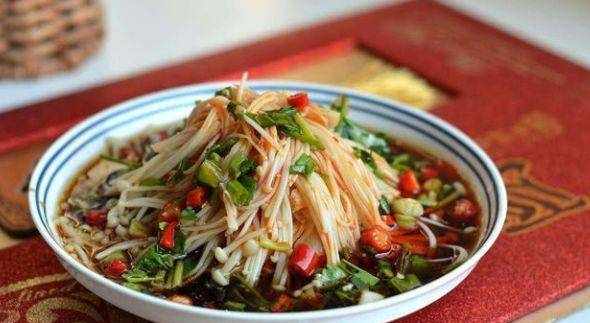 5、将一碗汁淋在金针菇上,然后取两勺辣椒油,即食或泡一会,味道和口感都很好。