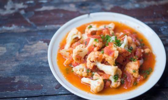 1、花菜洗净用手去皮成小朵,番茄洗净,用开水烫去皮,切小方块,葱切碎;