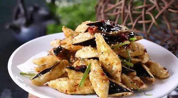 3、将煮熟的茄子放入面糊中炸透,捞出装盘。