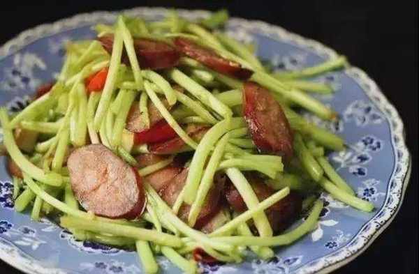 准备:1.将蒿子切成楔形,将香肠切成薄片。