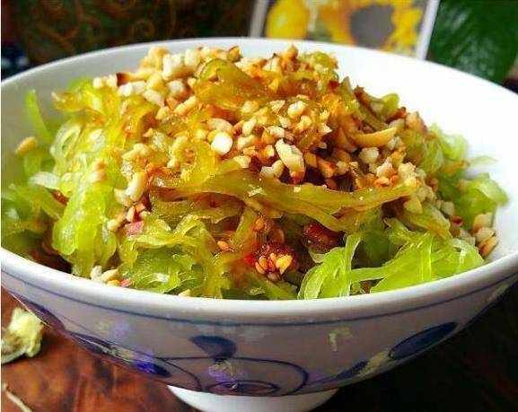 3、趁热将花椒油加入酱汁中,搅拌均匀;将煮好的酱汁均匀地浇在生菜丝上;最后撒上花生碎。