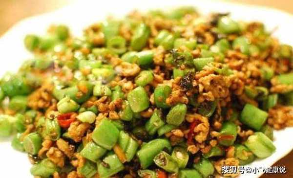 6、将豆子放入锅中炒熟,炒时加少量水,豆子熟后加入之前炒过的肉末,加入适量的盐搅拌均匀;