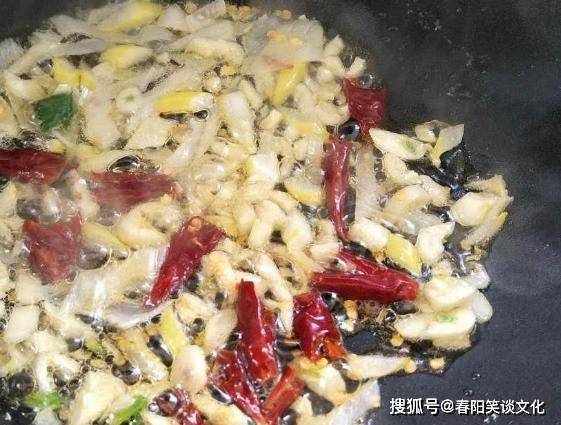 第三步:在平底锅中加热油。油烧开后,加入葱花、姜末、蒜末和干辣椒翻炒出香味。