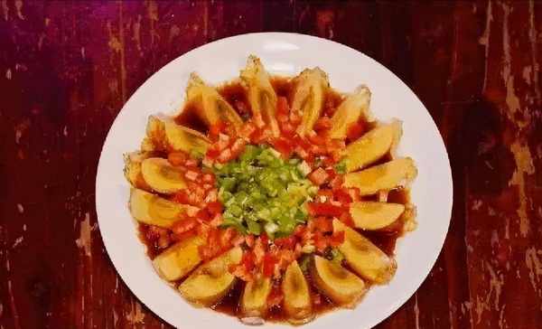 制作方法:1.将皮蛋切成花瓣状,铺在盘子里2.青红椒切碎,入锅炒熟,加盐,蚝油,生抽,老抽少许,色泽少许
