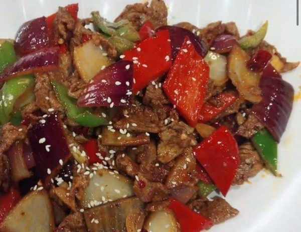 原料:牛肉;洋葱;姜;辣椒酱;老抽;甜酒;芝麻油;淀粉(土豆);糖
