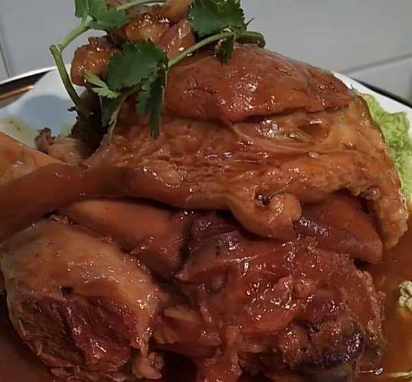 制法:1.肘子洗净,放入锅中,加入葱姜料酒煮五分钟,捞出洗净待用。2、锅内油烧热,加入冰糖炒至焦黄,倒入开水入肘子,加入葱姜、八角、豆瓣酱、腐乳汁、生抽、蚝油、老抽、盐、十三香、鸡精、小火炖五十分钟