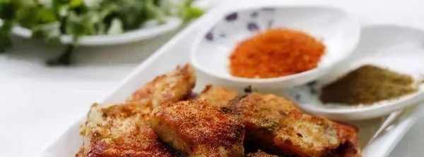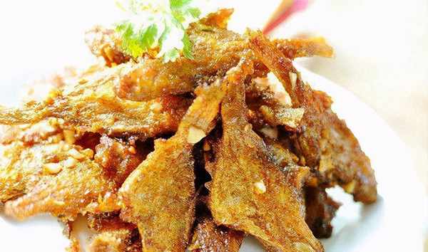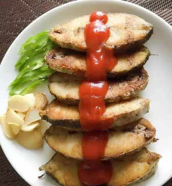 2、锅内加少许油烧至80%热,放入蒜片炒熟,捞出备用,鱼片炸至焦黄,放入锅中,撒上黑胡椒粉,和淋上番茄酱。