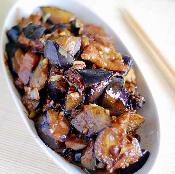 3.倒掉油,留底油,加入葱姜爆香;倒入准备好的酱汁炒香,加入茄子炒香;这一步先放盐,不要加盐,出锅前放入蒜茸,倒入水和淀粉,开大火快炒,蒜茸出香味后关火热量和服务。