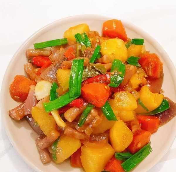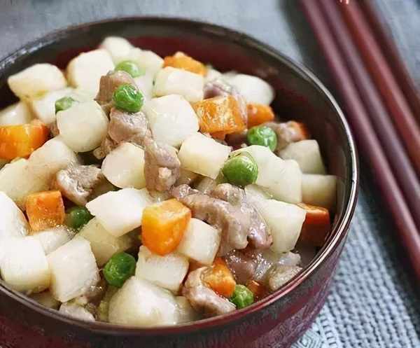 配料表:胡萝卜、山药、豌豆、牛肉、淀粉、胡椒粉、酱油、料酒、油、葱、姜、味精、盐