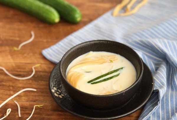 -材料-绿豆芽100克、黄瓜100克、豆腐条50克、豆浆750毫升、盐、根和果粉适量