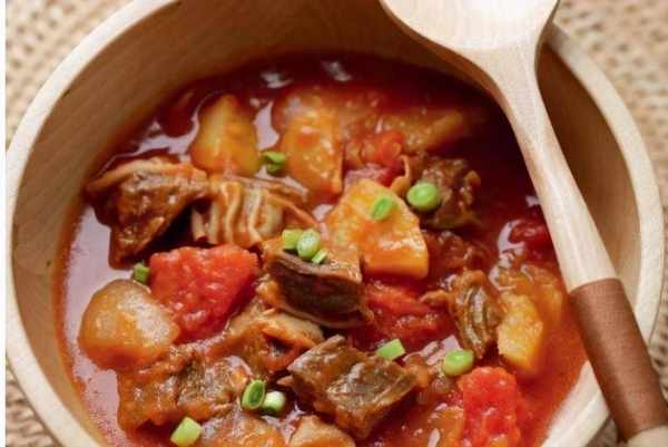 1、将炖好的牛肉切成2厘米见方的方块。2.将番茄切成小块。