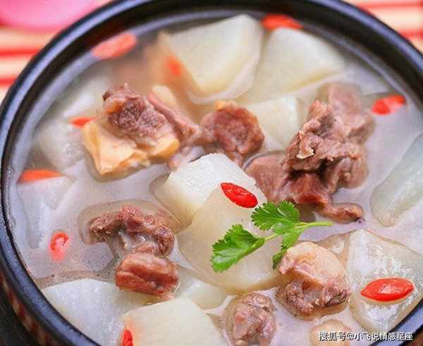 食材:羊肉250g、白萝卜150g、枸杞5g、大料1枚、大葱2段、鲜姜2片、料酒10ml、盐5g、胡椒粉3g、油5ml