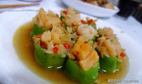 8、将丝瓜段摆盘,将炒好的干贝丝放在丝瓜段上,将盘子放入蒸锅,大火蒸8—10分钟即可。