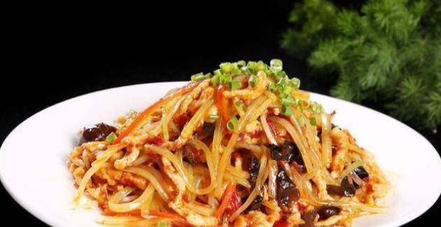 4、倒入鸡丝翻炒至变色。