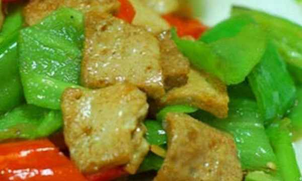 1、青红椒去籽切块,蒜苗切段,豆腐干切片。