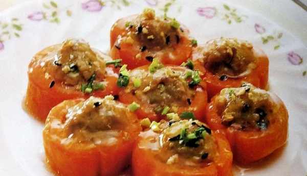 5.等肉馅都填充好之后,将胡萝卜块装盘;