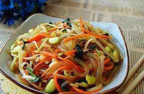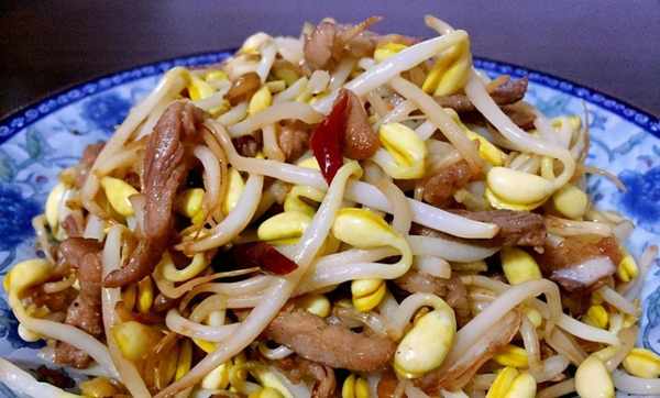 食材:豆芽、粉条、肉丝、葱、姜、盐、酱油