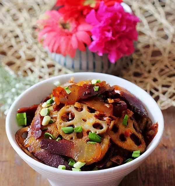 4、锅里油倒出,将切碎的豆瓣酱放入锅中,不断煸炒,炒出红油后,放入葱姜煸香,倒入炸好的藕片一起翻炒,放入腊肉片翻炒,最后加入一勺白糖翻炒均匀,即可出锅装盘,最后撒少许芝麻或葱花装饰