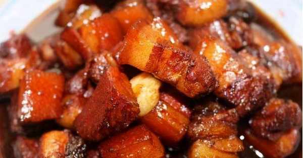 2.锅上火烧热不放油,用比较肥的五花肉放进去炒出油,然后放入冰糖熬化,下入生姜片、八角、桂皮等香料炒出香味,再放入五花肉翻炒。五花肉炒至变色之后倒入生抽、老抽、蚝油和适量的额水,没过食材即可。盖上盖子烧开之后焖煮半个小时左右。时间到去掉盖子大火收汁即可。