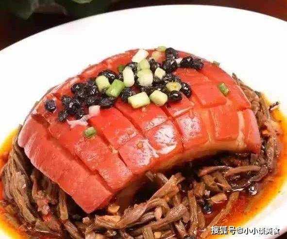 4、五花肉表皮改刀成均匀的小方块,底部斜刀切成方块,取码斗抹上少许油,肉皮朝下扣在碗中,盖上炒好的豇豆,添高汤适量,覆膜旺火蒸2小时。