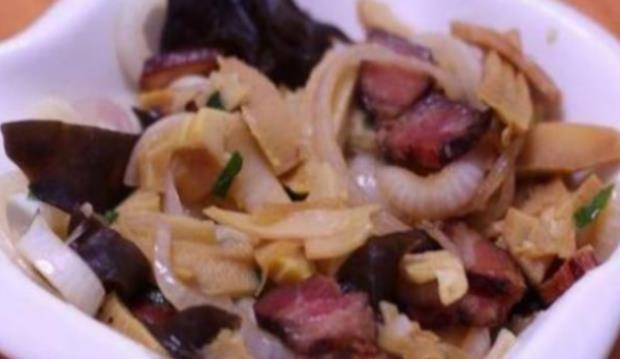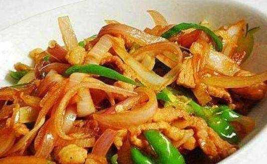 材料:洋葱1个、瘦猪肉1块、辣椒1个、花椒少许、餐酒1汤匙、干淀粉、盐适量、植物油