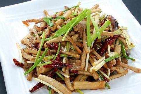 5.炒至茶树菇稍微变软,加入盐和鸡精翻炒均匀