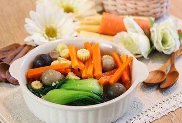 配料表:胡萝卜、小青菜、小玉米、盐、味全高鲜、植物油、植物高汤