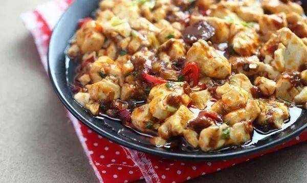 2.取油锅,加入姜丝和豆瓣酱翻炒至红油渗出。加入豆腐丁和辣椒,翻炒几分钟