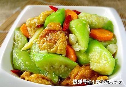 材料:丝瓜、面筋油、胡萝卜、姜、蒜、干辣椒