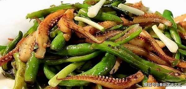 5、姜末、青椒、鱿鱼一起炒。待青椒变色时,加入盐、料酒和少许水,煮沸1分钟,加入味精即可食用。