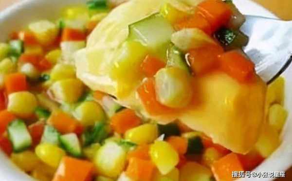 3、热锅下玉米、青豆、胡萝卜丁翻炒,收干后加少许水撒上香油,蒸好的蛋羹加半勺酱油,下蔬菜丁。炸在上面即可食用。