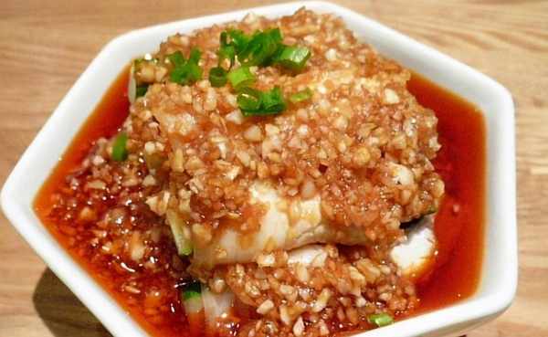 2.将鸡汤和辣椒油加入蒜末调成酱汁。
