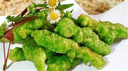 3、起锅,锅中加入精炼油,等油温升到40%左右,将平菇条在步骤(2)做好的抹茶酥里滚一下,然后放入平底锅加油煎。炸好取出,再把油温调高放回油中炸,炸至翠绿金黄,捞出倒掉油装盘。