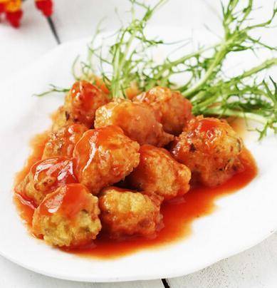 9、滴入适量食用油调成番茄汁;10、将做好的番茄酱淋在丸子上,撒上白芝麻。