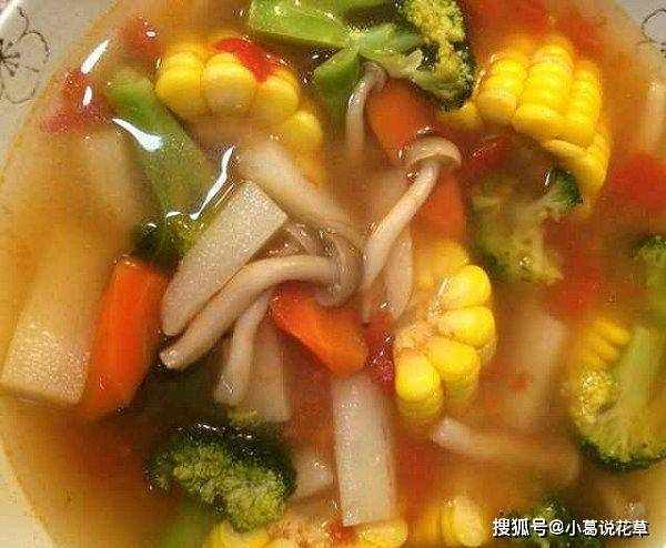 材料:西红柿、玉米、南瓜、香菇、小蘑菇、西兰花、青菜、豆腐、香菇、盐、胡椒粉、香油