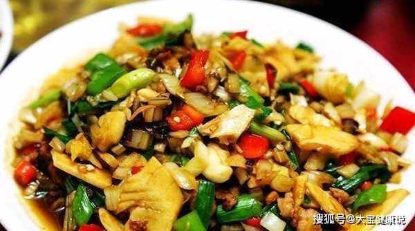 3.将油倒入煎锅中。油热后,先倒入切好的笋片在油中炸一下,再倒入切好的香菇一起拌匀。烧少许料酒炒一会即可上桌