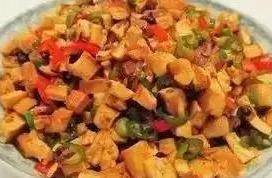 4、油烧热,加入辣酱元木、干大肠、青红椒、盐、酱油、料酒炒熟。