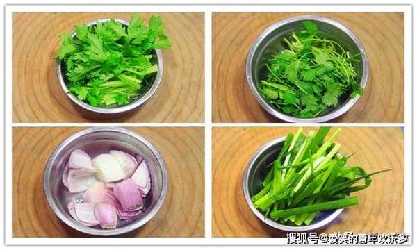 1.我们把食材处理一下,带叶的香芹,切成小段,小葱从中间切开切成长段,香菜一小把,切成香菜段,生姜一小块切成薄片,洋葱半个切成片后抓散。