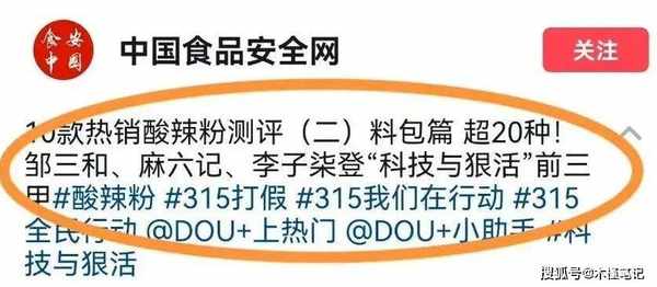 除此之外,张兰汪小菲母子卖的酸辣粉也遭到了点名,据中国食品安全网透露,他们一共测评了20多种热销的酸辣粉,其中汪小菲自创的麻六记品牌就名列前茅。