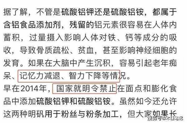 当然,这还不算,最主要的是汪小菲家的麻六记添加了铵明矾,这种添加剂吃多了容易引起老年痴呆、智力下降、记忆力减退等情况,无论是大人还是小孩,都不能够多吃。此外,早在2014年,国家就明令禁止面点和食品中加入这类添加剂。