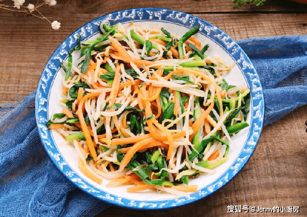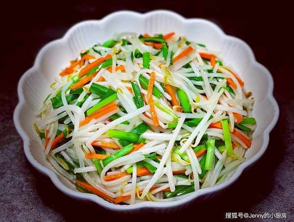 韭菜摘净洗净,沥干水分,再切成小段待用。胡萝卜去皮洗净,切成细丝;绿豆芽冲洗干净,沥干水分。