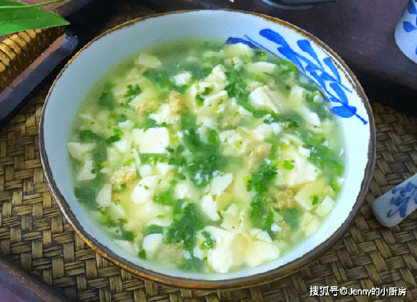 接着倒入适量热水,再倒入豆腐丁、荠菜,大火煮一两分钟。
